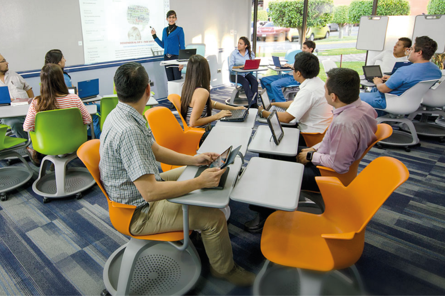 El laboratorio de aprendizaje es un ambiente con mobiliario flexible que facilita el trabajo en equipo y la transición entre los distintos modelos pedagógicos. Además, cuenta con la tecnología idónea para soportar la pedagogía moderna dentro de un espacio de aprendizaje formal.